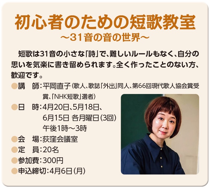 初心者のための短歌教室~31音の音の世界~ 4月20日、5月18日、6月15日各月曜日(3回)開催